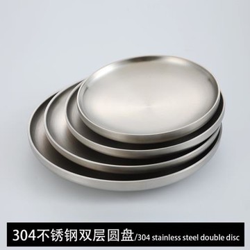 304不銹鋼拉絲磨砂雙層圓托盤商用韓式烤肉店餐館創意餐具圓餐盤