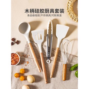 硅膠廚具套裝木柄硅膠不粘鍋烹飪鏟勺12件套廚房新款收納筷籠