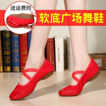 特絲麗她紅色舞蹈鞋女軟底中老年跳舞鞋成人中跟廣場舞鞋帆布舞鞋