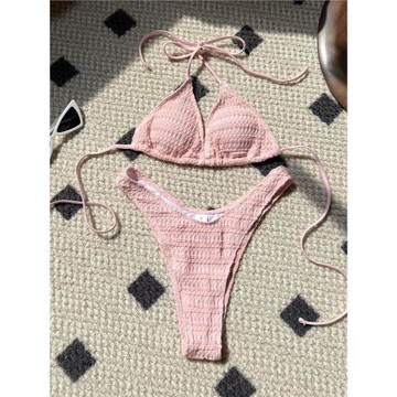 Amber外單純色掛脖系帶比基尼性感分體泳衣女士綁帶三點式帶胸墊
