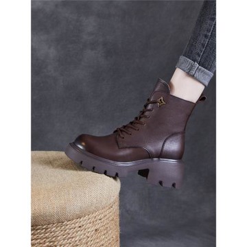 真皮短靴女粗跟防雨雪厚底馬丁靴2024秋冬英倫風復古高幫棉皮鞋子