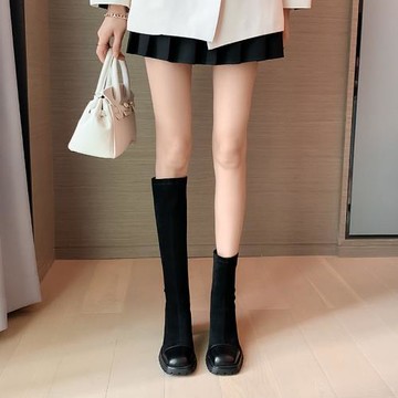 蔣小艾拼接高跟瘦瘦靴女高級感粗跟短靴秋冬長筒靴冬彈力長靴靴子