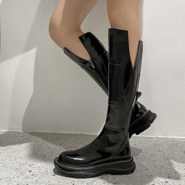 長腿神靴!歐美黑色亮漆皮V口長靴女高筒騎士靴圓頭厚底中跟ins潮