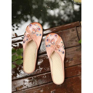 春夏季包頭繡花拖鞋女式外穿淑女平底軟底復古盤扣家居室內托鞋女
