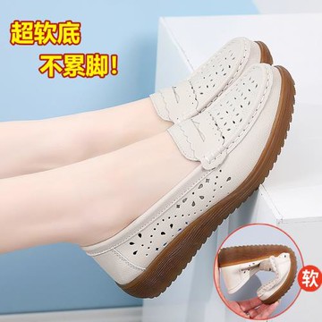 便鞋女縷空透氣春夏新款輕便軟底懶人一腳蹬坡跟媽媽真皮單鞋扦鞋