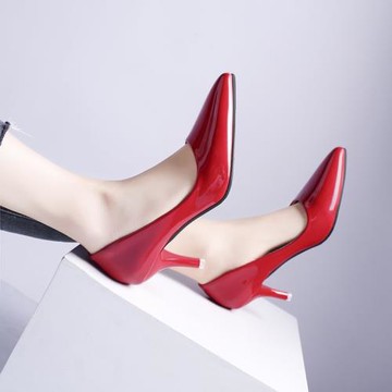 高跟鞋女紅色婚鞋光面淺口中跟3-5cm尖頭工作職業單鞋皮鞋學生ol