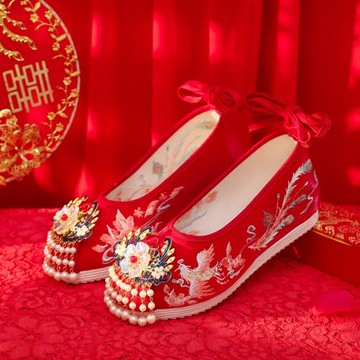 舞繡緣漢服鞋結婚新款春秋坡跟紅色翹頭古風鞋繡花鞋婚鞋配秀禾服