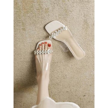 水鉆高跟涼拖鞋2024年新款透明一字帶女鞋方頭外穿小眾設計高跟鞋