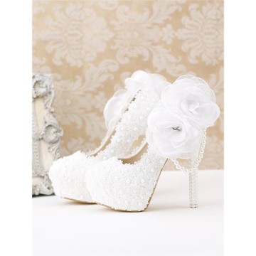 白色蕾絲花朵婚鞋超高跟防水臺婚紗照鞋珍珠吊墜女單鞋細跟新娘鞋