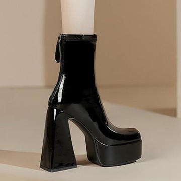 時尚黑色皮革側拉鍊厚底短靴.白鳥麗子
