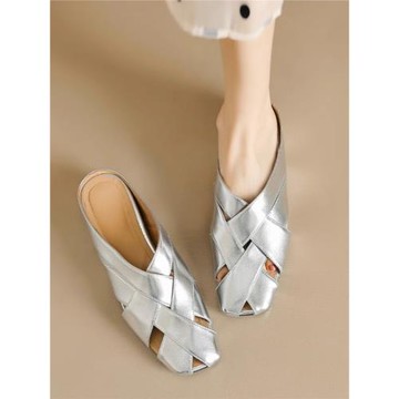 2024涼拖鞋編織內增高銀色穆勒鞋女夏坡跟金色包頭法式氣質半拖鞋