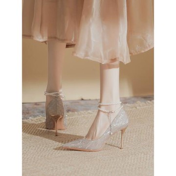 香檳色新娘高跟鞋女細跟婚鞋2024年新款珍珠水晶伴娘鞋一字帶單鞋