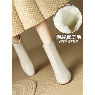 白色小短靴女秋冬加絨加厚高跟大棉鞋圓頭粗跟羊毛真皮法式雪地靴