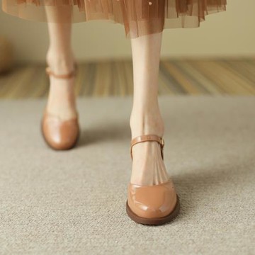 厚底鞋 BYHUE 簡約全真皮T字瑪莉珍軟芯微Q底厚底鞋-杏