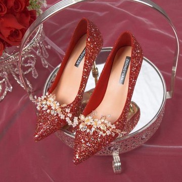 秀禾服婚紗兩穿婚鞋女亮片高級感法式細跟中式新娘鞋紅色高跟鞋