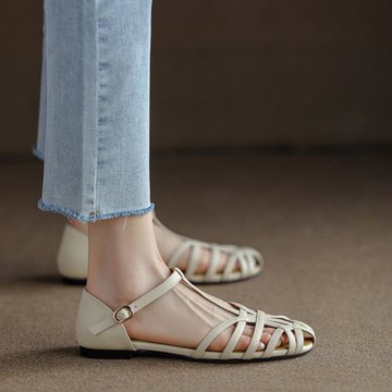 復古羅馬文藝風鏤空包頭涼鞋女粗跟2024夏新款真皮T字型涼鞋平底