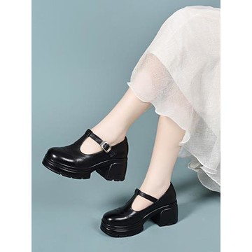 真皮棕色瑪麗珍鞋女2025年春季新款厚底防水臺粗跟圓頭休閑小皮鞋