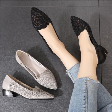 2023新款時尚中跟網紗鏤空女鞋帶鉆媽媽鞋子女夏粗跟40-50歲皮鞋