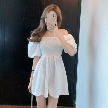夏季法式新款連體衣女氣質一字肩方領泡泡袖連身闊腿連體短褲套裝