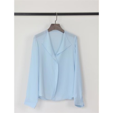 天藍V領翻邊長袖雪紡衫女 春夏新款涼爽透氣通勤純色套頭襯衫小衫