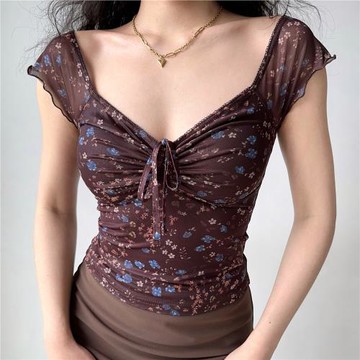Go Girl Go自制歐美風胸前收褶碎花v領短袖T恤女修身性感短款上衣