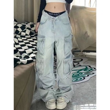 DDNX美式街頭多口袋直筒工裝牛仔褲女2024新款春秋寬松休閑闊腿褲