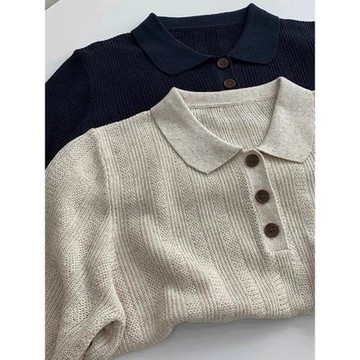 日系復古時尚寬松翻領針織短袖女夏季別致肌理感休閑百搭POLO衫潮