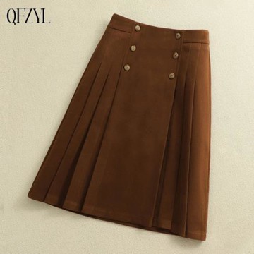 咖色毛呢半身裙女2024新款秋冬款高腰中長款半裙A字百褶冬裙冬季