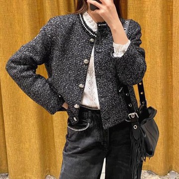 元品質 M家 秋冬法式優雅珍珠裝飾邊圓領短款小香風花呢外套上衣