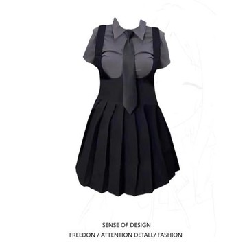 大碼胖妹妹學院風甜辣妹短袖領帶襯衫+純欲收腰百褶連衣裙兩件套