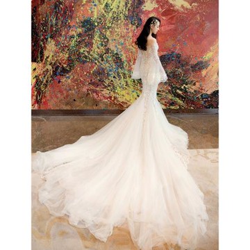 法式魚尾主婚紗2025新款復古大拖尾輕森系新娘一字肩領證高級質感
