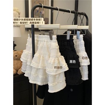 荷葉邊蛋糕半身裙女夏季短裙法式高腰蓬蓬a字裙子杏色防走光裙褲
