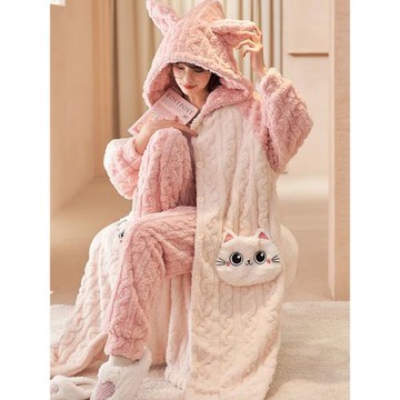 睡衣女2022年新款秋冬季三層夾棉加厚珊瑚絨可外穿連帽甜美家居服