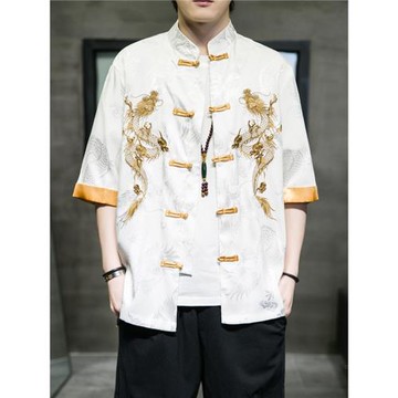 夏季復古盤扣立領短袖襯衫中國風男裝印花唐裝中式漢服五分袖襯衫