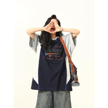 野生阿子原創夏季新品美式復古拼接撞色短袖T恤男女寬松情侶上衣
