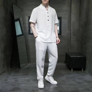 白色褶皺提花冰絲短袖t恤男夏季高級感男裝中國風唐裝男士套裝薄