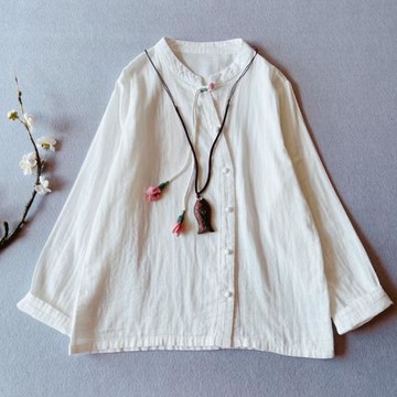 秋季女裝盤扣復古中國風立領純色棉麻長袖襯衫女文藝襯衣打底上衣