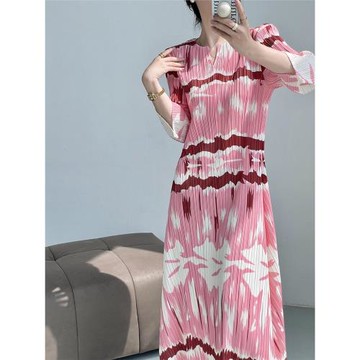 三宅國風優雅氣質連衣裙女七分袖春夏薄款寬松遮肉長裙褶皺裙減齡