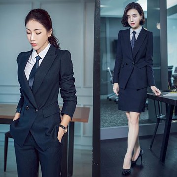 漣影條紋西裝套裝女職業裝商務正裝藏青西服外套房地產銷售工作服