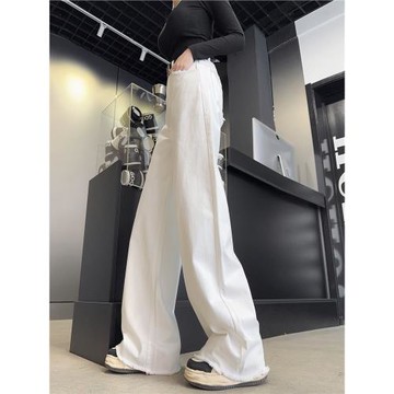 淺布調QBD 高個子加長褲春秋高腰毛須寬松直筒闊腿褲白色牛仔褲女
