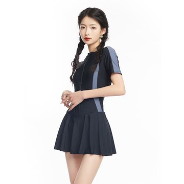 新款連體裙式平角保守運動款專業游泳夏學生小胸短袖泳衣女泡溫泉