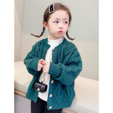 斷碼清倉 童裝3-8歲女童綠色開衫外套女寶寶粗毛衣針織上衣