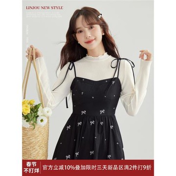 玲玖法式碎花吊帶連衣裙兩件套女秋冬新款小個子收腰顯瘦a字長裙