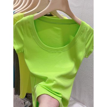 果綠色u領短袖t恤女2025夏季新款修身純棉性感時尚墊肩短款上衣