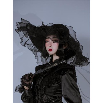 黑色綴飾寬簷帽。蓬鬆的寬簷帽,綴飾垂至地面的流蘇。