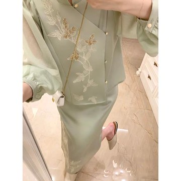 早春新中式國風小香風釘珠刺繡外套女高級感綠色改良旗袍兩件套裝