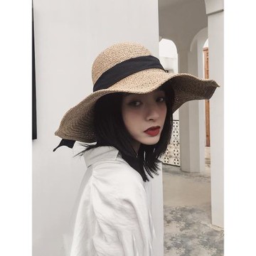 草編帽毛邊平頂大檐拉菲草帽女夏天沙灘帽海邊度假防曬大沿遮陽帽