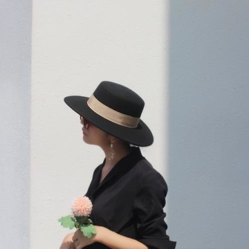 黑色綴飾寬簷帽。蓬鬆的寬簷帽,綴飾垂至地面的流蘇。