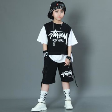 兒童街舞演出服夏機能風短袖潮服男童嘻哈hiphop表演服女童爵士舞
