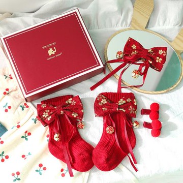 嬰兒新生兒寶寶公主禮盒滿月紅色喜慶過年中國風禮物發帶襪子套裝